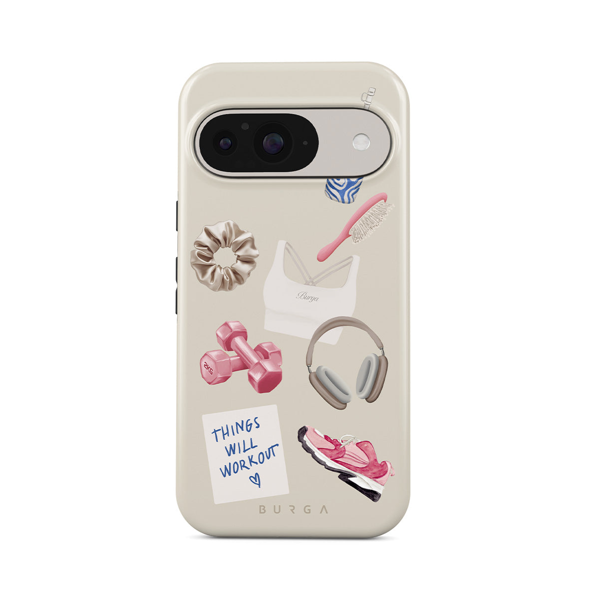 Główne elementy projektu: hantle, słuchawki, kubek termiczny, szczotkę do włosów, różowe sneakersy, sportowy stanik, baton Crunchie, karteczkę „Things Will Work Out”.