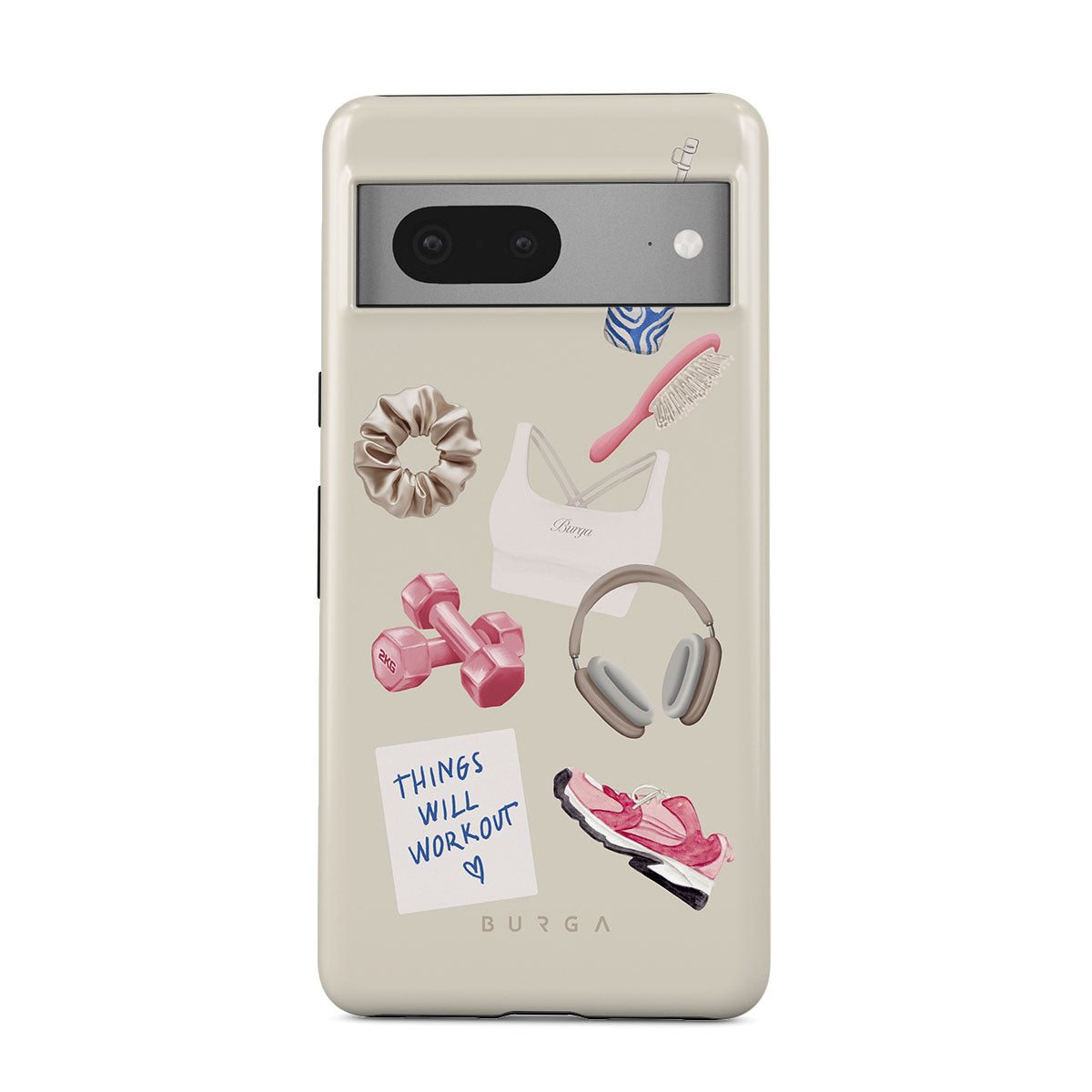 Główne elementy projektu: hantle, słuchawki, kubek termiczny, szczotkę do włosów, różowe sneakersy, sportowy stanik, baton Crunchie, karteczkę „Things Will Work Out”.