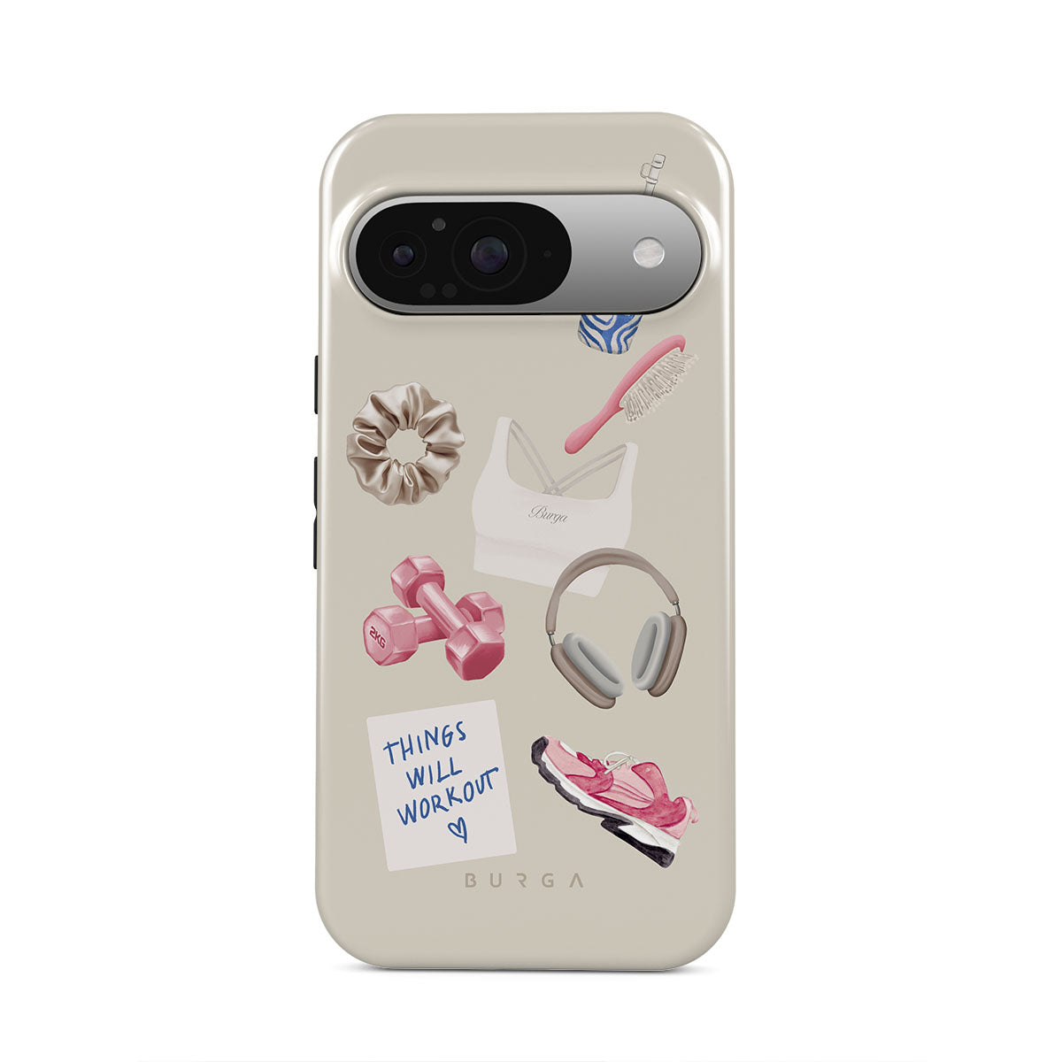Główne elementy projektu: hantle, słuchawki, kubek termiczny, szczotkę do włosów, różowe sneakersy, sportowy stanik, baton Crunchie, karteczkę „Things Will Work Out”.