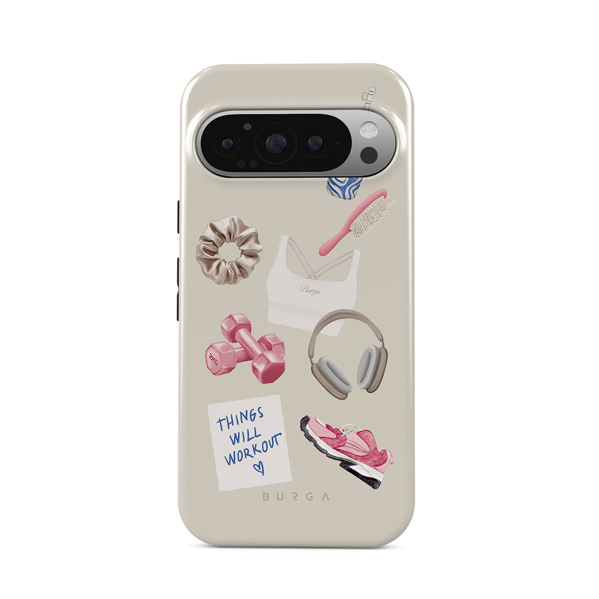 Główne elementy projektu: hantle, słuchawki, kubek termiczny, szczotkę do włosów, różowe sneakersy, sportowy stanik, baton Crunchie, karteczkę „Things Will Work Out”.