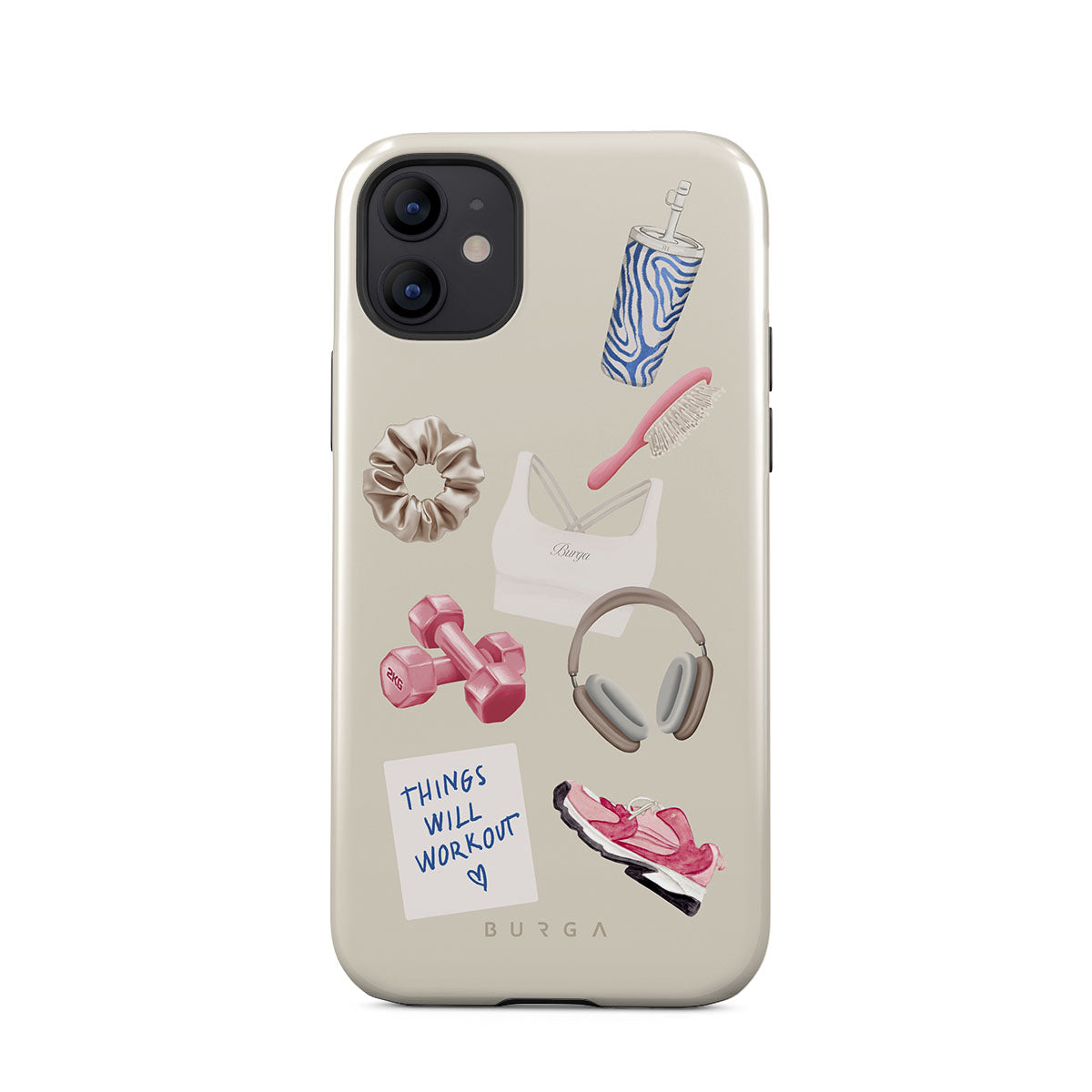 Główne elementy projektu: hantle, słuchawki, kubek termiczny, szczotkę do włosów, różowe sneakersy, sportowy stanik, baton Crunchie, karteczkę „Things Will Work Out”.