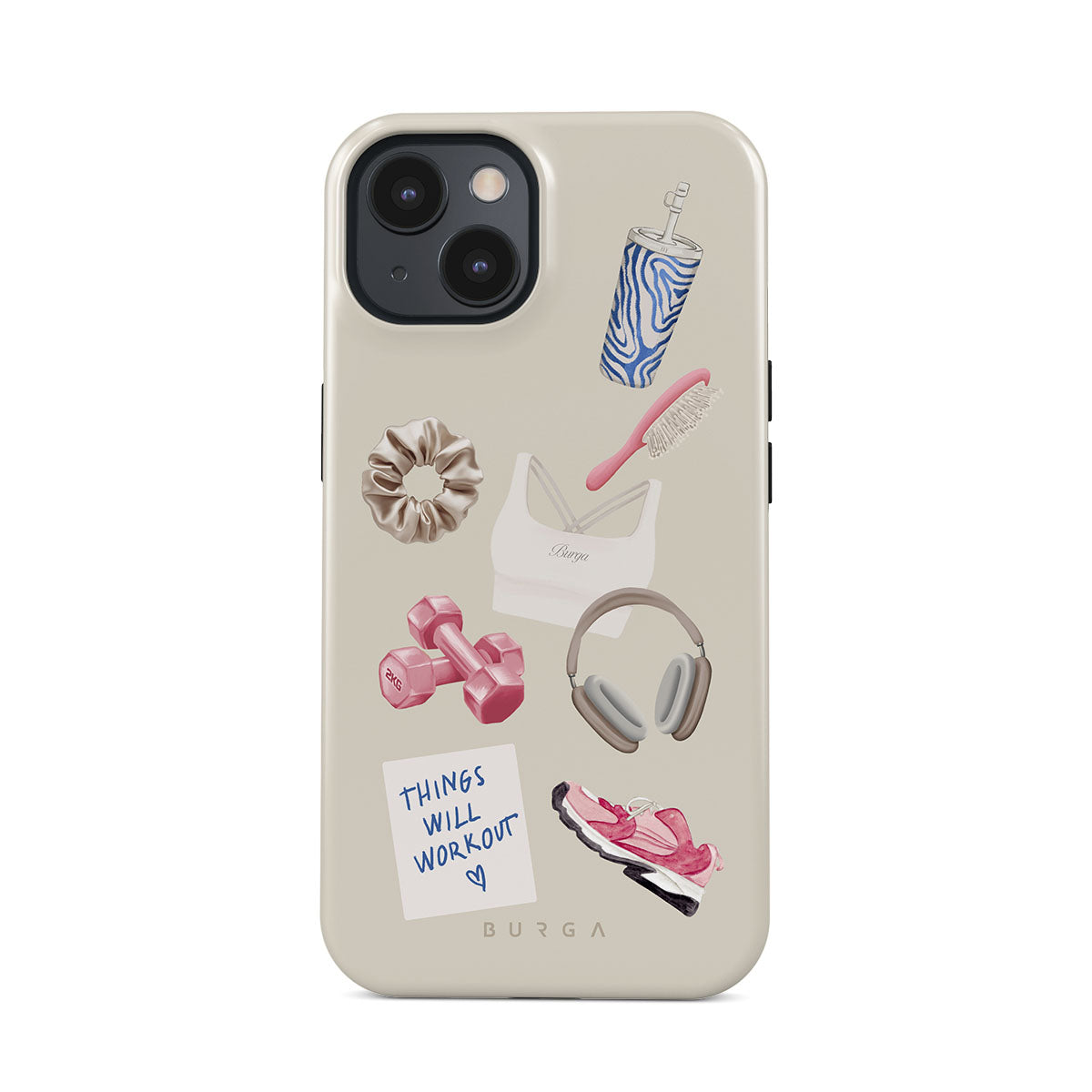 Główne elementy projektu: hantle, słuchawki, kubek termiczny, szczotkę do włosów, różowe sneakersy, sportowy stanik, baton Crunchie, karteczkę „Things Will Work Out”.