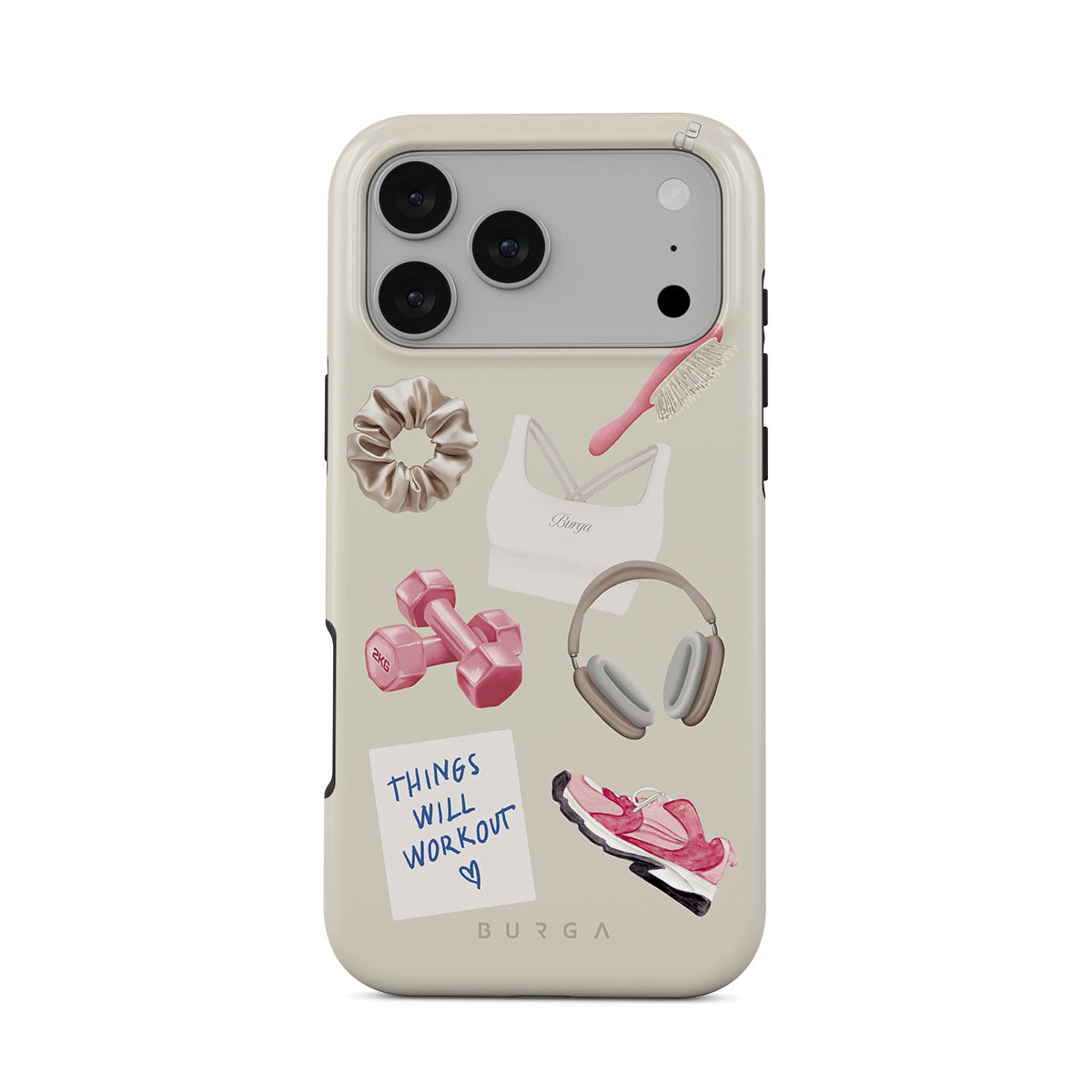 Główne elementy projektu: hantle, słuchawki, kubek termiczny, szczotkę do włosów, różowe sneakersy, sportowy stanik, baton Crunchie, karteczkę „Things Will Work Out”.