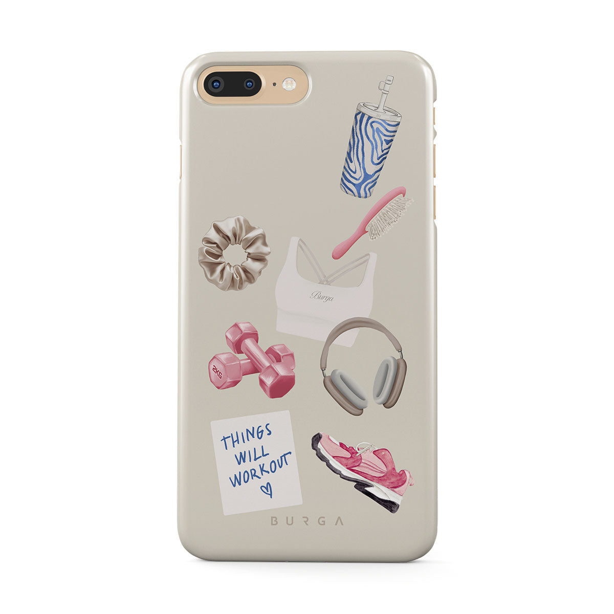 Główne elementy projektu: hantle, słuchawki, kubek termiczny, szczotkę do włosów, różowe sneakersy, sportowy stanik, baton Crunchie, karteczkę „Things Will Work Out”.