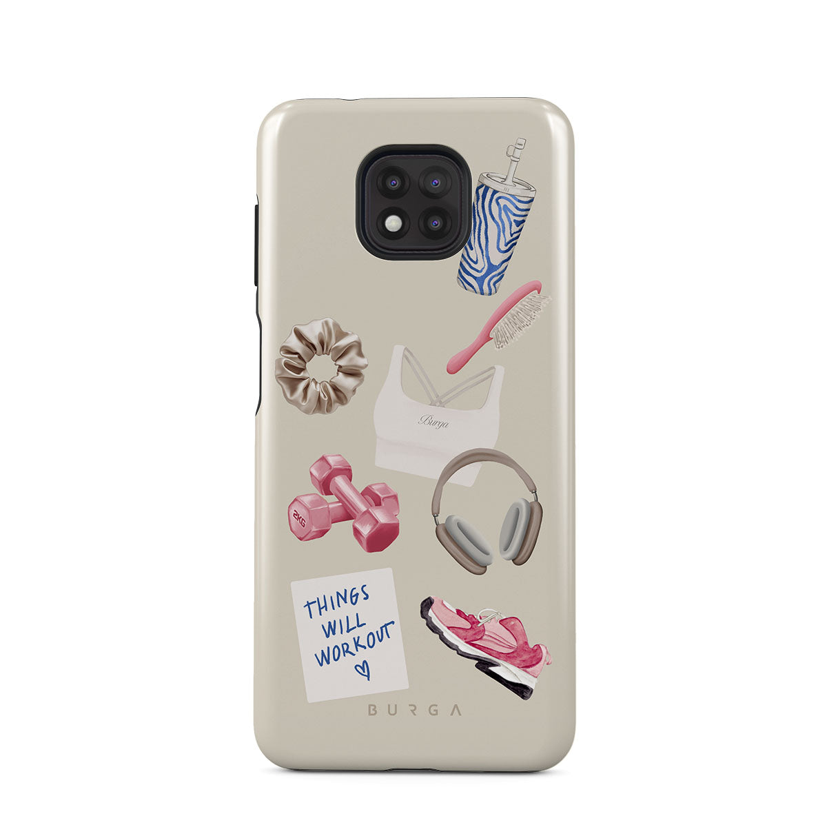 Główne elementy projektu: hantle, słuchawki, kubek termiczny, szczotkę do włosów, różowe sneakersy, sportowy stanik, baton Crunchie, karteczkę „Things Will Work Out”.