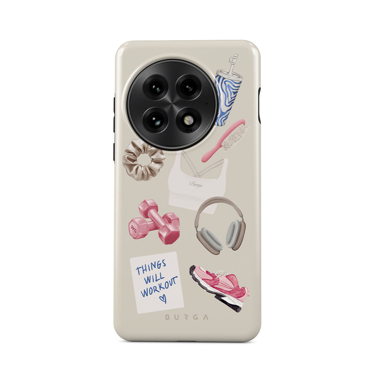 Główne elementy projektu: hantle, słuchawki, kubek termiczny, szczotkę do włosów, różowe sneakersy, sportowy stanik, baton Crunchie, karteczkę „Things Will Work Out”.