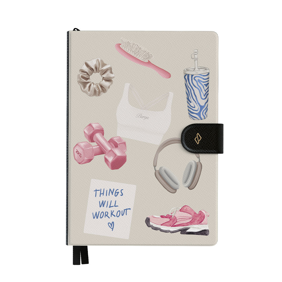 Główne elementy projektu: hantle, słuchawki, kubek termiczny, szczotkę do włosów, różowe sneakersy, sportowy stanik, baton Crunchie, karteczkę „Things Will Work Out”.