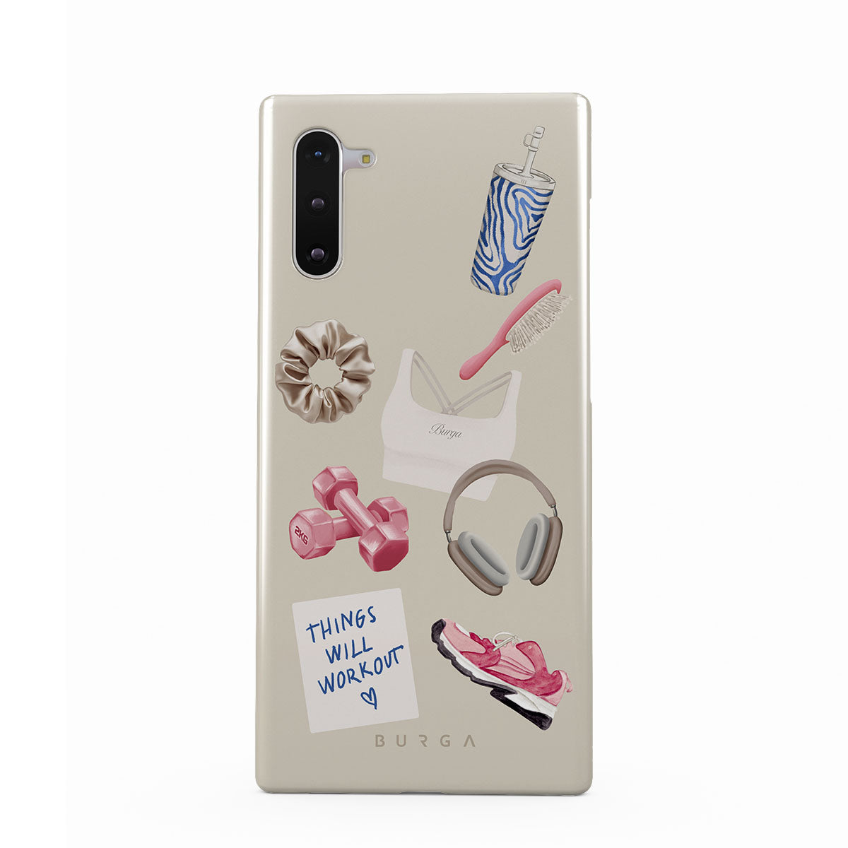 Główne elementy projektu: hantle, słuchawki, kubek termiczny, szczotkę do włosów, różowe sneakersy, sportowy stanik, baton Crunchie, karteczkę „Things Will Work Out”.