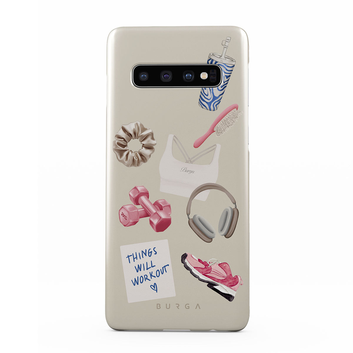 Główne elementy projektu: hantle, słuchawki, kubek termiczny, szczotkę do włosów, różowe sneakersy, sportowy stanik, baton Crunchie, karteczkę „Things Will Work Out”.