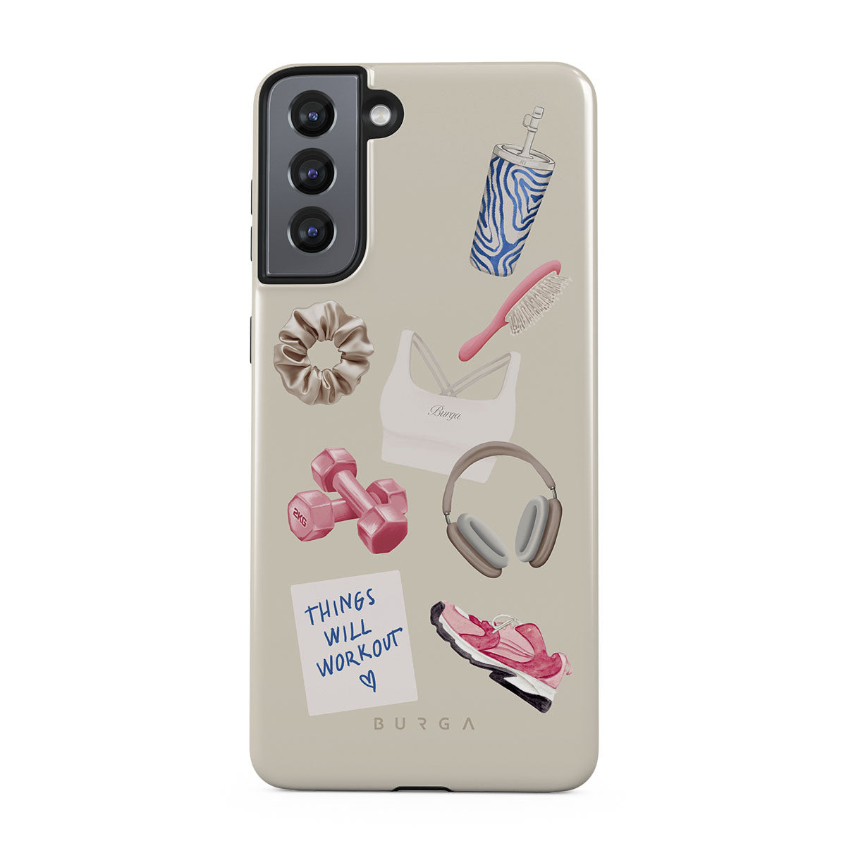 Główne elementy projektu: hantle, słuchawki, kubek termiczny, szczotkę do włosów, różowe sneakersy, sportowy stanik, baton Crunchie, karteczkę „Things Will Work Out”.