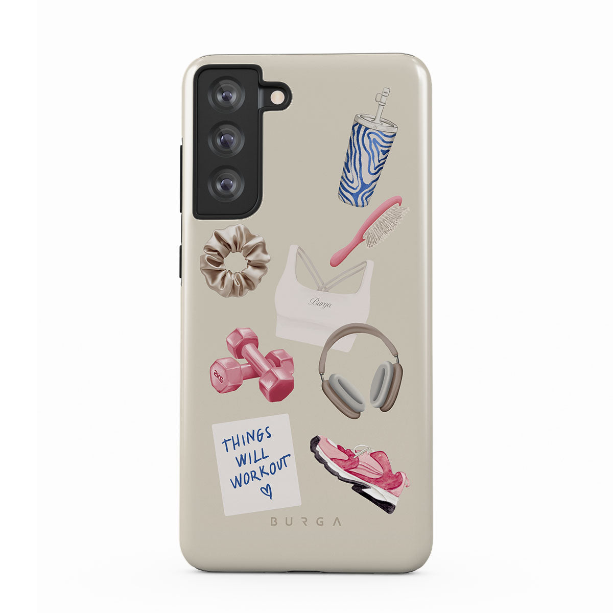 Główne elementy projektu: hantle, słuchawki, kubek termiczny, szczotkę do włosów, różowe sneakersy, sportowy stanik, baton Crunchie, karteczkę „Things Will Work Out”.