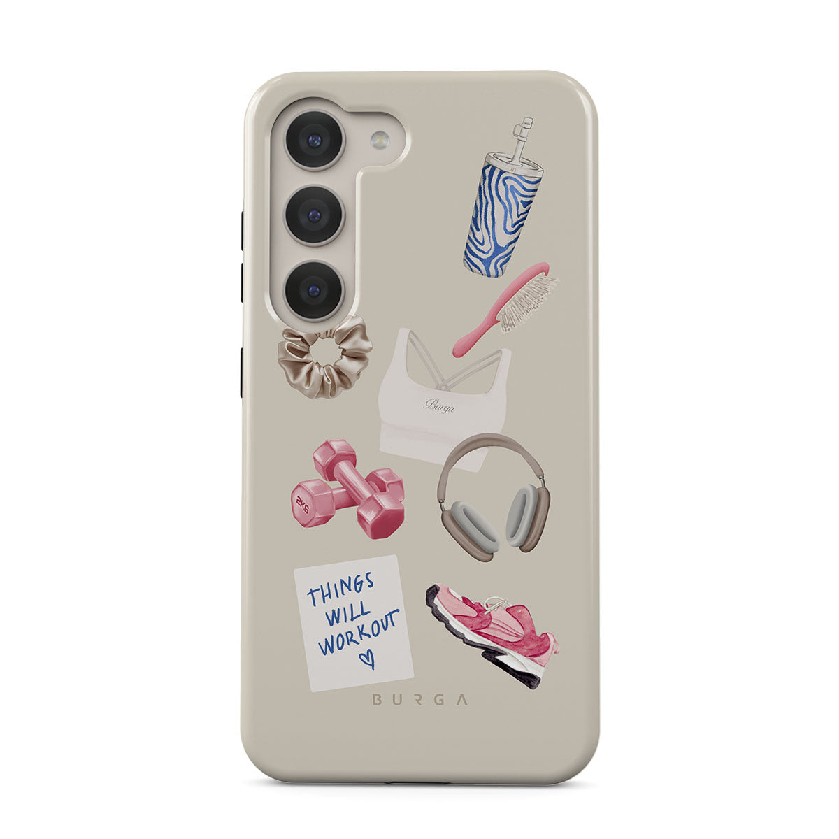 Główne elementy projektu: hantle, słuchawki, kubek termiczny, szczotkę do włosów, różowe sneakersy, sportowy stanik, baton Crunchie, karteczkę „Things Will Work Out”.
