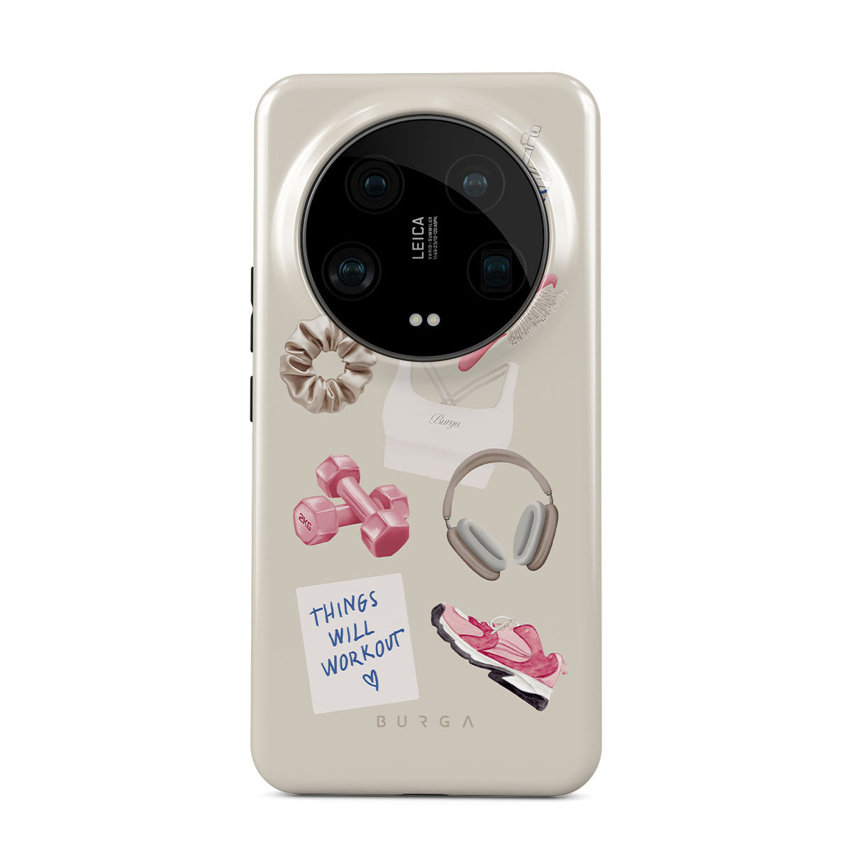 Główne elementy projektu: hantle, słuchawki, kubek termiczny, szczotkę do włosów, różowe sneakersy, sportowy stanik, baton Crunchie, karteczkę „Things Will Work Out”.