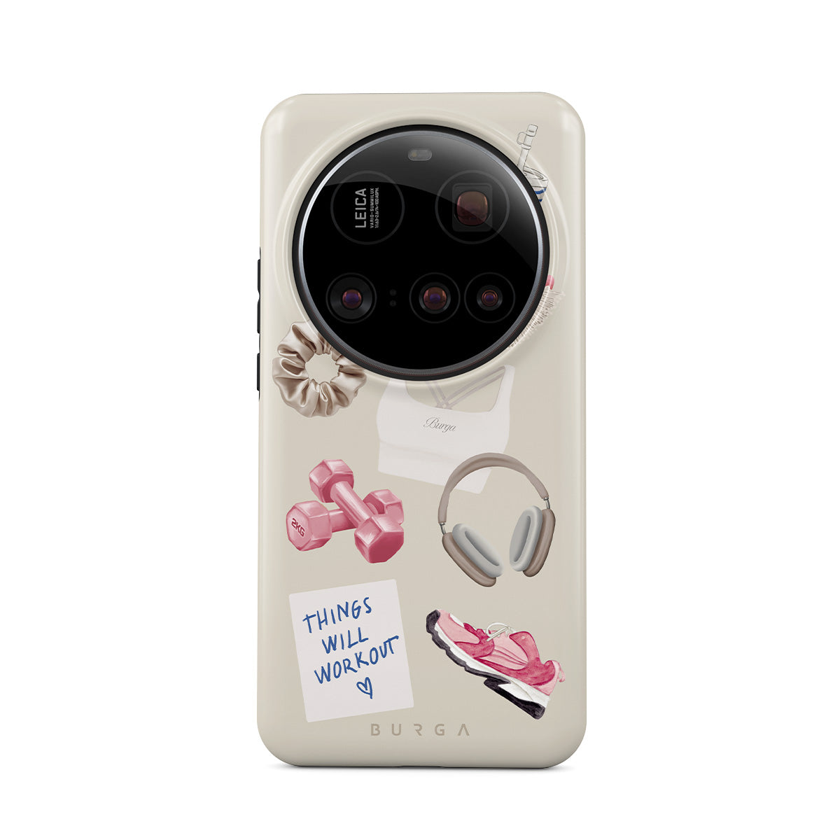 Główne elementy projektu: hantle, słuchawki, kubek termiczny, szczotkę do włosów, różowe sneakersy, sportowy stanik, baton Crunchie, karteczkę „Things Will Work Out”.