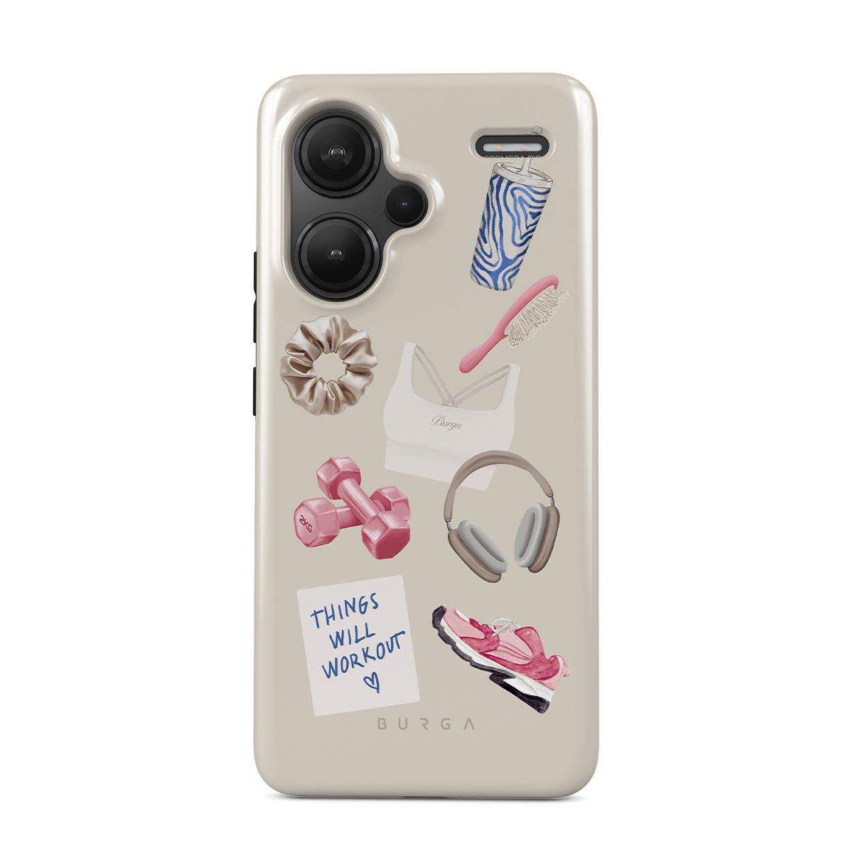 Główne elementy projektu: hantle, słuchawki, kubek termiczny, szczotkę do włosów, różowe sneakersy, sportowy stanik, baton Crunchie, karteczkę „Things Will Work Out”.