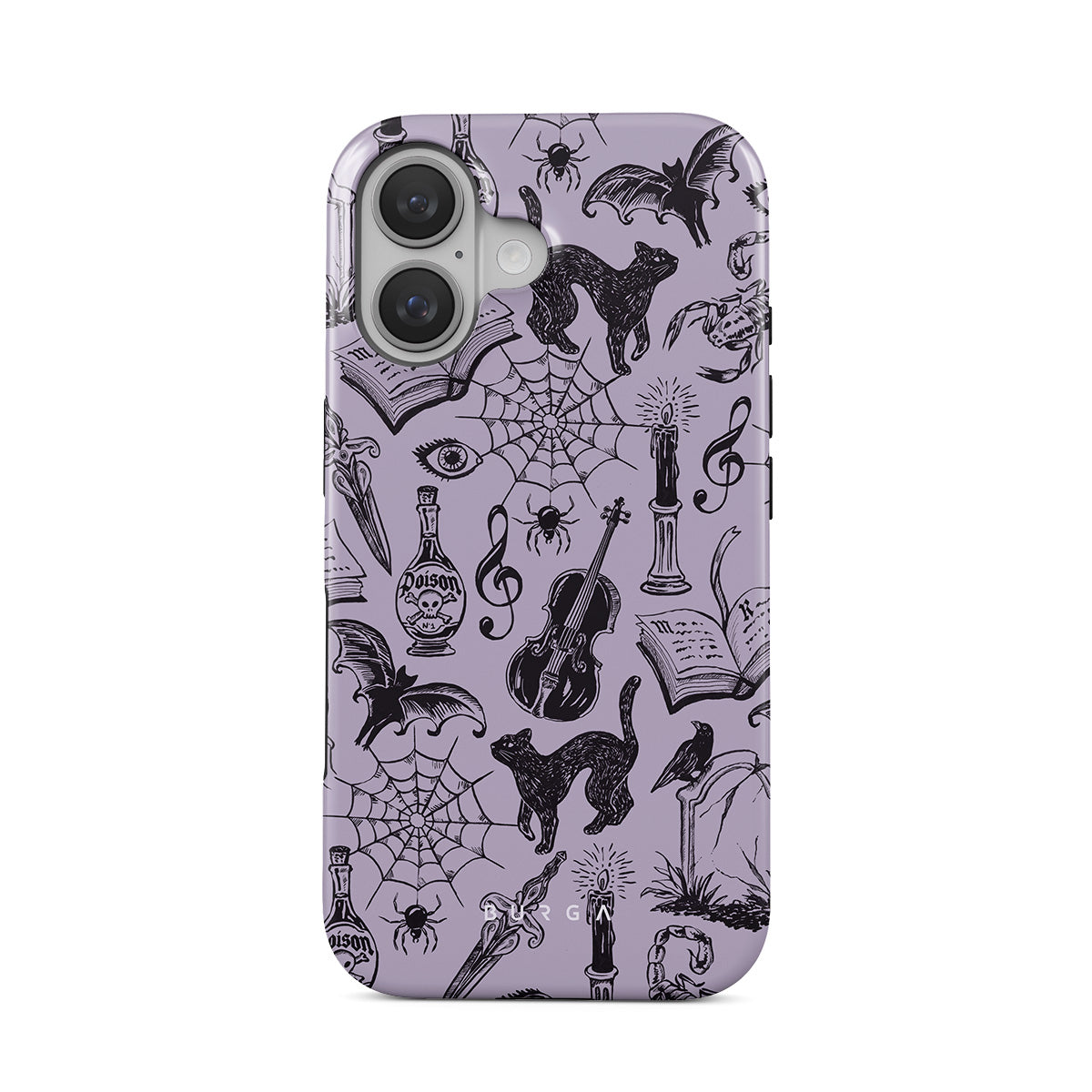 Główne elementy projektu: gotyckie bazgroły, mistyczne elementy, pająki, pajęczyna, kot, skrzypce, oko, świeca, sztylet, książka, nietoperz, kruk, skorpion