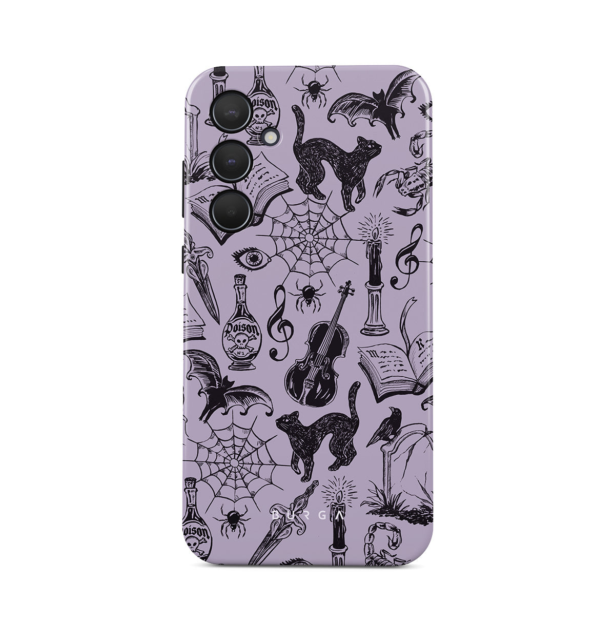 Główne elementy projektu: gotyckie bazgroły, mistyczne elementy, pająki, pajęczyna, kot, skrzypce, oko, świeca, sztylet, książka, nietoperz, kruk, skorpion
