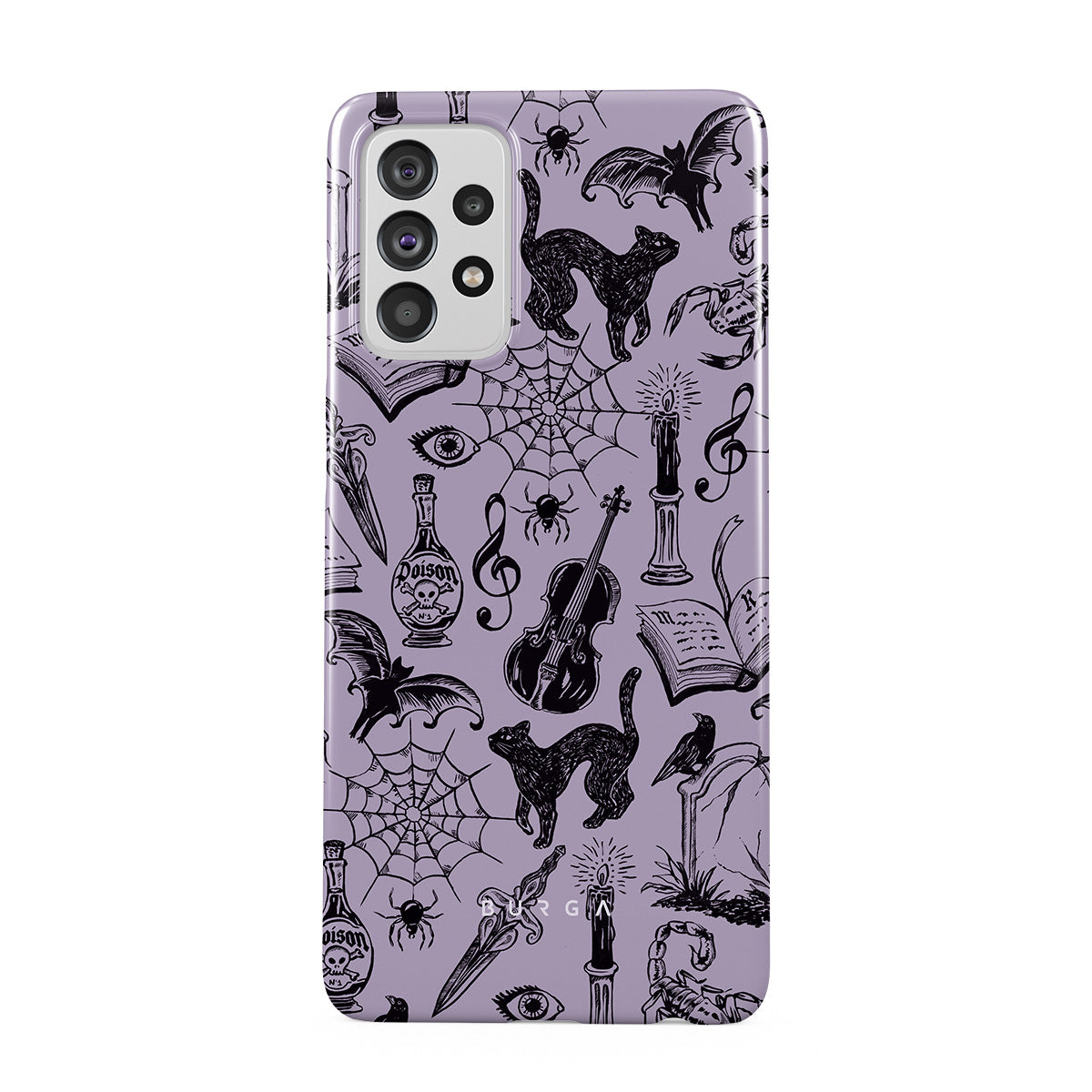 Główne elementy projektu: gotyckie bazgroły, mistyczne elementy, pająki, pajęczyna, kot, skrzypce, oko, świeca, sztylet, książka, nietoperz, kruk, skorpion