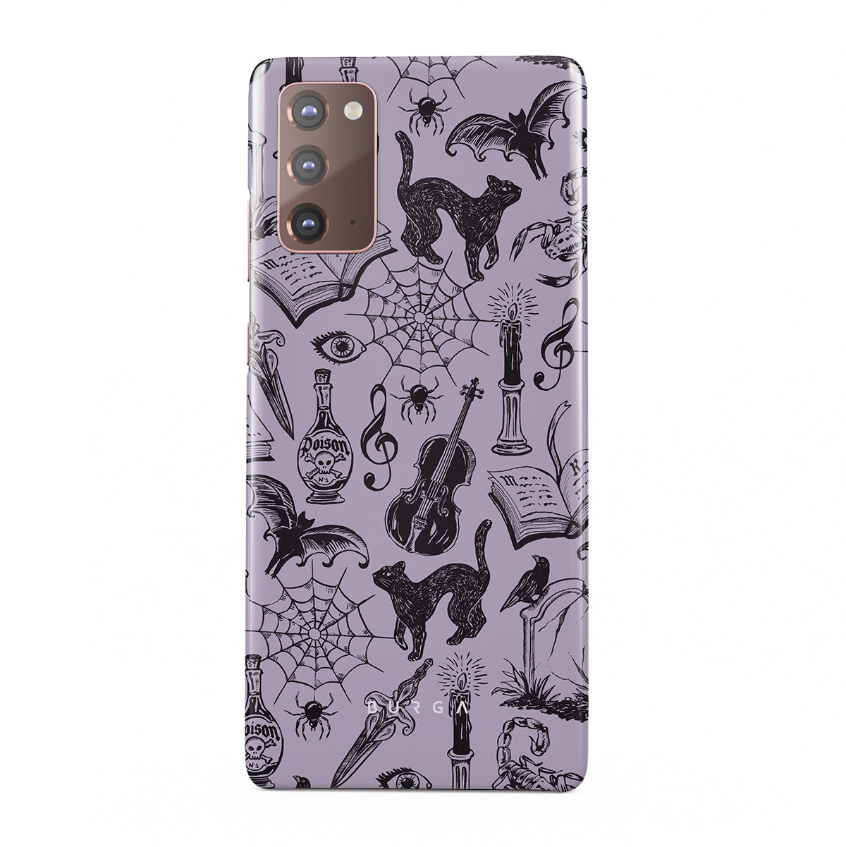 Główne elementy projektu: gotyckie bazgroły, mistyczne elementy, pająki, pajęczyna, kot, skrzypce, oko, świeca, sztylet, książka, nietoperz, kruk, skorpion