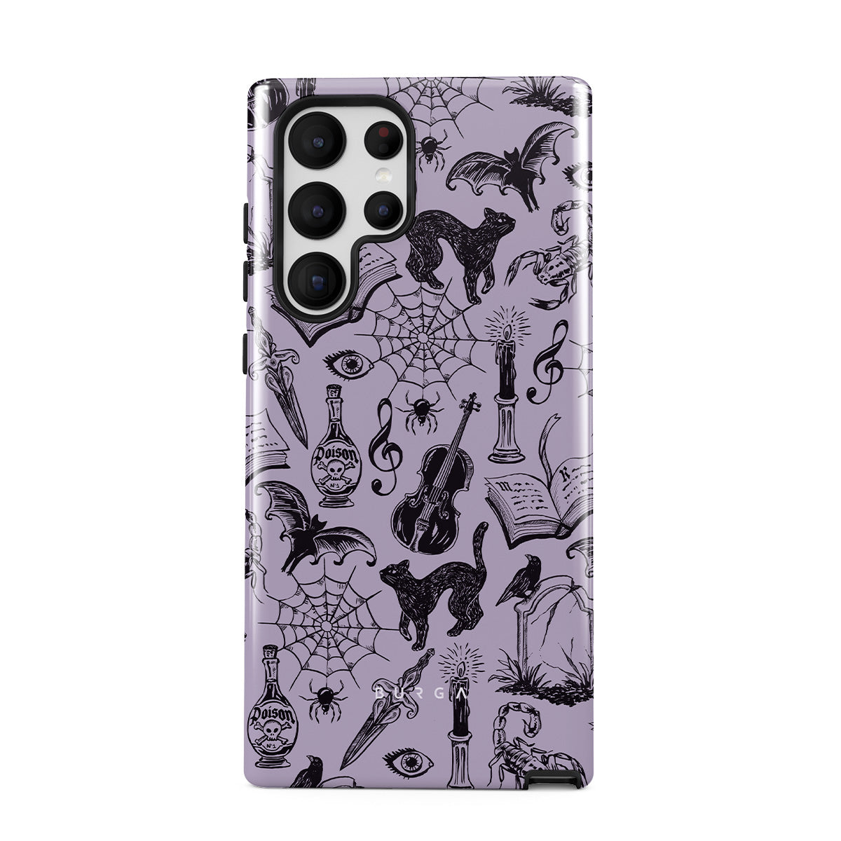 Główne elementy projektu: gotyckie bazgroły, mistyczne elementy, pająki, pajęczyna, kot, skrzypce, oko, świeca, sztylet, książka, nietoperz, kruk, skorpion