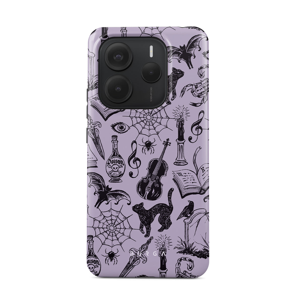 Główne elementy projektu: gotyckie bazgroły, mistyczne elementy, pająki, pajęczyna, kot, skrzypce, oko, świeca, sztylet, książka, nietoperz, kruk, skorpion