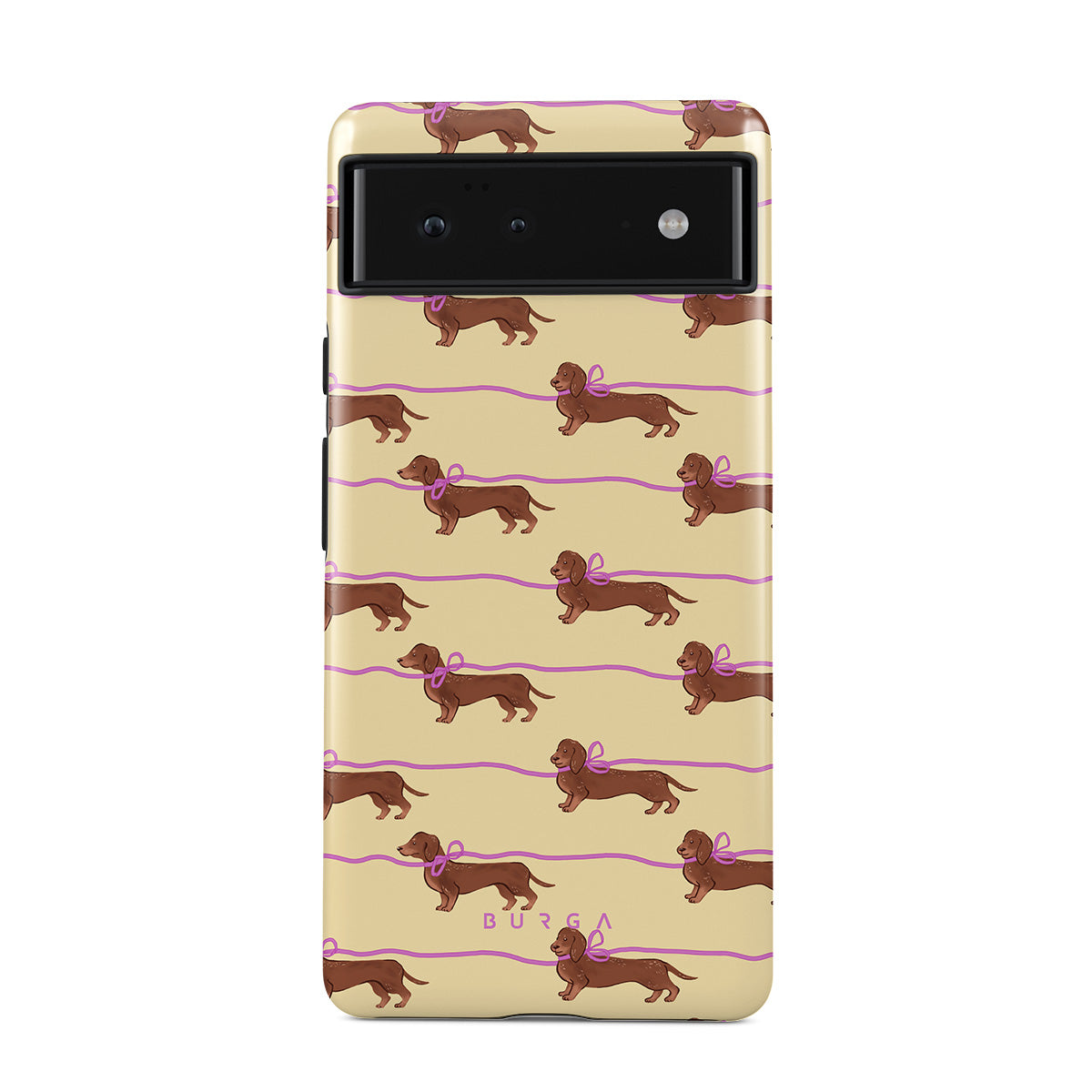 Główne elementy projektu: jamniki z różowymi kokardkami, urocze pieski.
