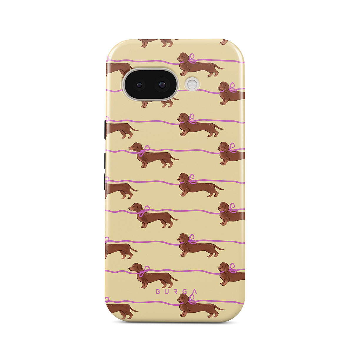Główne elementy projektu: jamniki z różowymi kokardkami, urocze pieski.