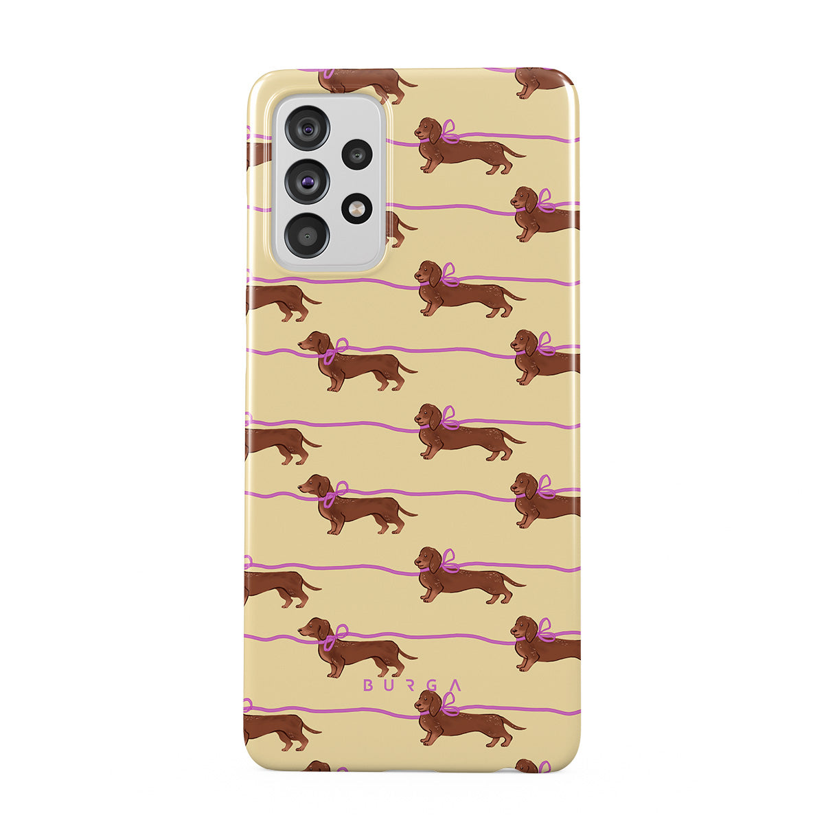 Główne elementy projektu: jamniki z różowymi kokardkami, urocze pieski.