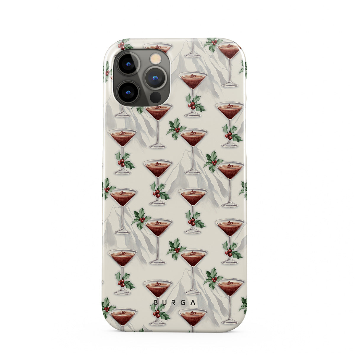 Główne elementy projektu: kieliszki do koktajli, martini, liście ostrokrzewu