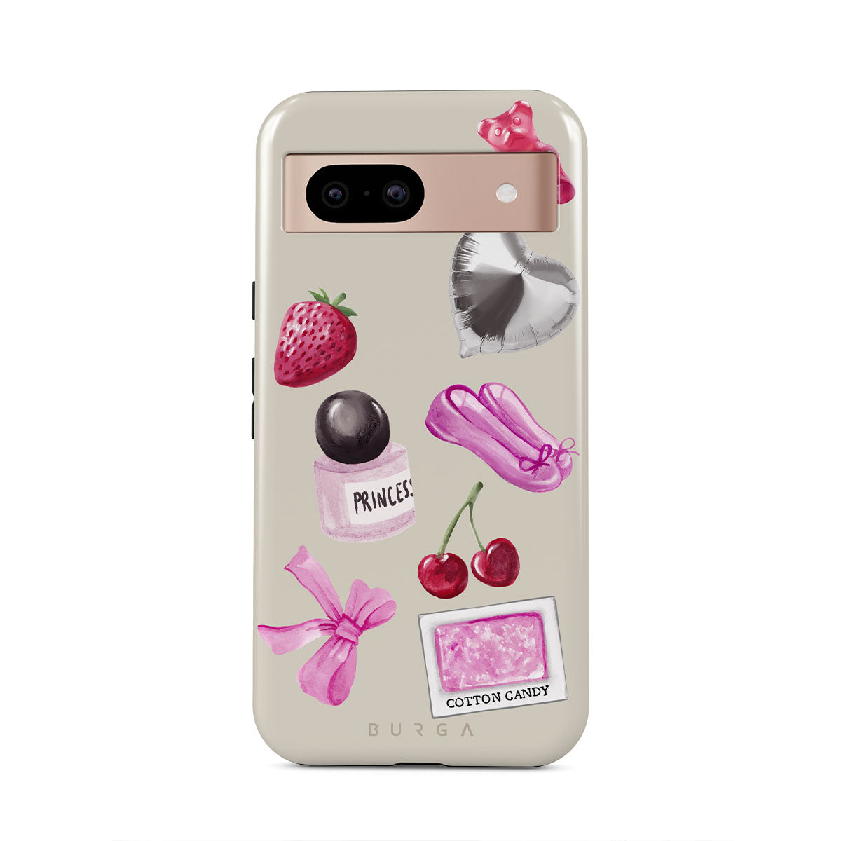 Główne elementy projektu: różową kokardę, srebrny balon w kształcie serca, buteleczkę perfum, truskawkę, wiśnie, różowe baletki, naklejkę waty cukrowej, różowego żelowego misia.