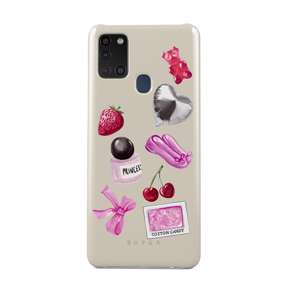 Główne elementy projektu: różową kokardę, srebrny balon w kształcie serca, buteleczkę perfum, truskawkę, wiśnie, różowe baletki, naklejkę waty cukrowej, różowego żelowego misia.