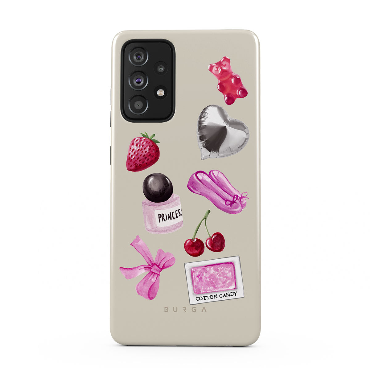 Główne elementy projektu: różową kokardę, srebrny balon w kształcie serca, buteleczkę perfum, truskawkę, wiśnie, różowe baletki, naklejkę waty cukrowej, różowego żelowego misia.