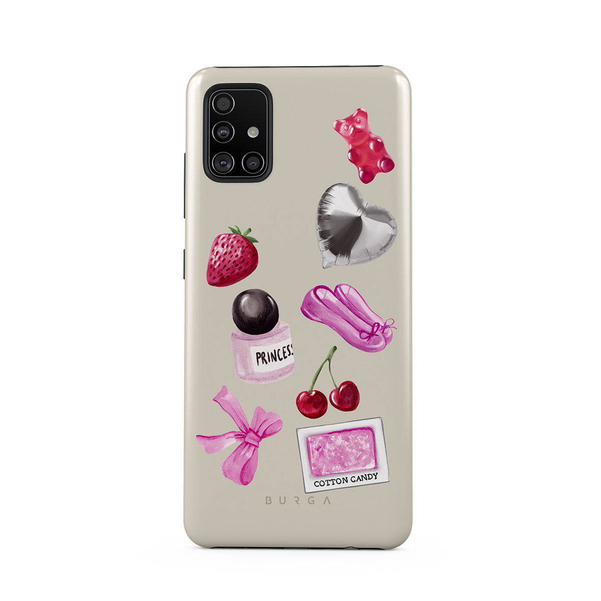 Główne elementy projektu: różową kokardę, srebrny balon w kształcie serca, buteleczkę perfum, truskawkę, wiśnie, różowe baletki, naklejkę waty cukrowej, różowego żelowego misia.