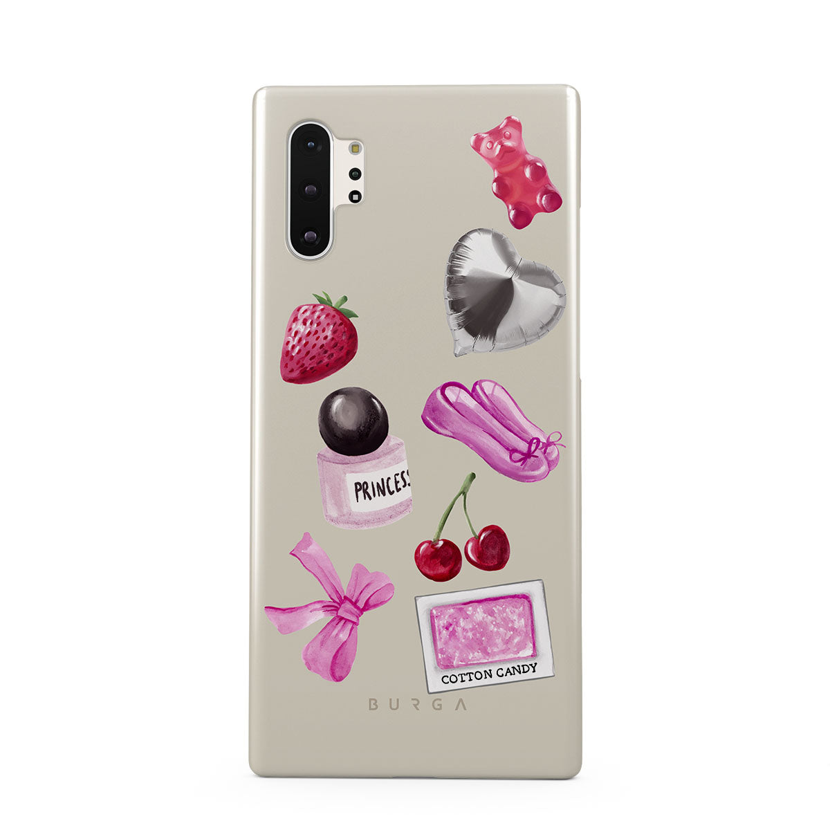 Główne elementy projektu: różową kokardę, srebrny balon w kształcie serca, buteleczkę perfum, truskawkę, wiśnie, różowe baletki, naklejkę waty cukrowej, różowego żelowego misia.