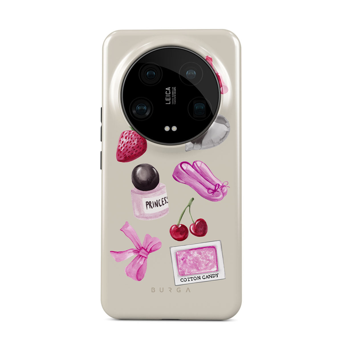 Główne elementy projektu: różową kokardę, srebrny balon w kształcie serca, buteleczkę perfum, truskawkę, wiśnie, różowe baletki, naklejkę waty cukrowej, różowego żelowego misia.