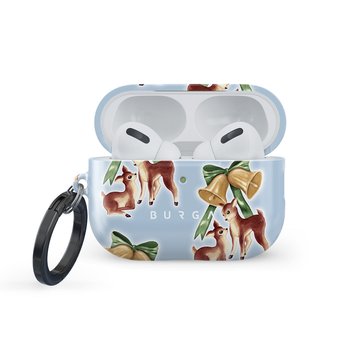 Główne elementy projektu: vintage jeleń, dzwonki świąteczne, złote dzwonki, retro ilustracja jelenia, młody jeleń, jasnoniebieskie tło