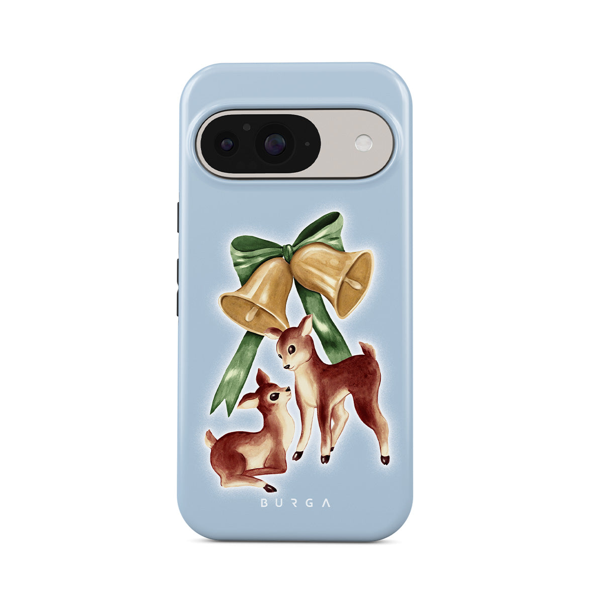 Główne elementy projektu: vintage jeleń, dzwonki świąteczne, złote dzwonki, retro ilustracja jelenia, młody jeleń, jasnoniebieskie tło