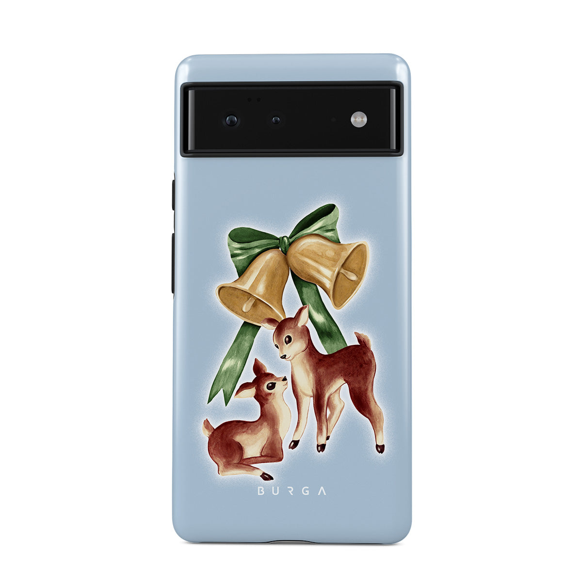 Główne elementy projektu: vintage jeleń, dzwonki świąteczne, złote dzwonki, retro ilustracja jelenia, młody jeleń, jasnoniebieskie tło