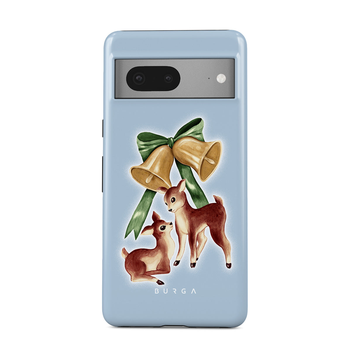 Główne elementy projektu: vintage jeleń, dzwonki świąteczne, złote dzwonki, retro ilustracja jelenia, młody jeleń, jasnoniebieskie tło
