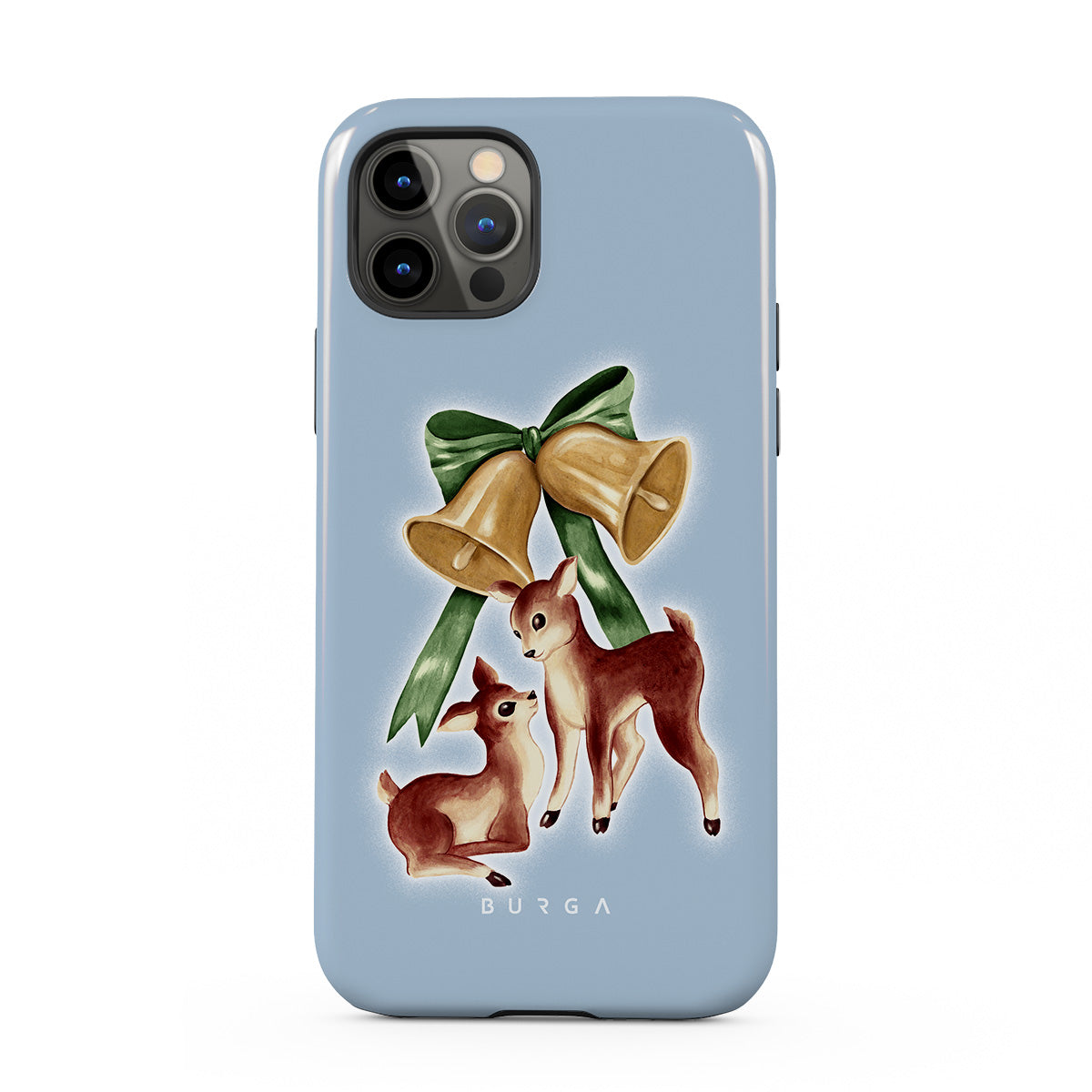 Główne elementy projektu: vintage jeleń, dzwonki świąteczne, złote dzwonki, retro ilustracja jelenia, młody jeleń, jasnoniebieskie tło