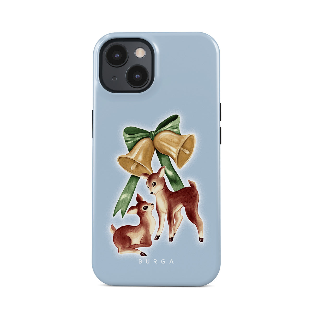 Główne elementy projektu: vintage jeleń, dzwonki świąteczne, złote dzwonki, retro ilustracja jelenia, młody jeleń, jasnoniebieskie tło
