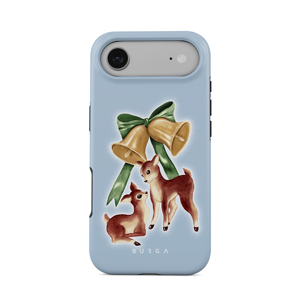 Główne elementy projektu: vintage jeleń, dzwonki świąteczne, złote dzwonki, retro ilustracja jelenia, młody jeleń, jasnoniebieskie tło