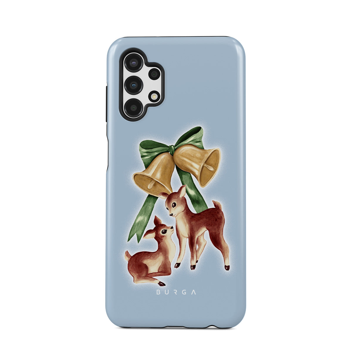Główne elementy projektu: vintage jeleń, dzwonki świąteczne, złote dzwonki, retro ilustracja jelenia, młody jeleń, jasnoniebieskie tło
