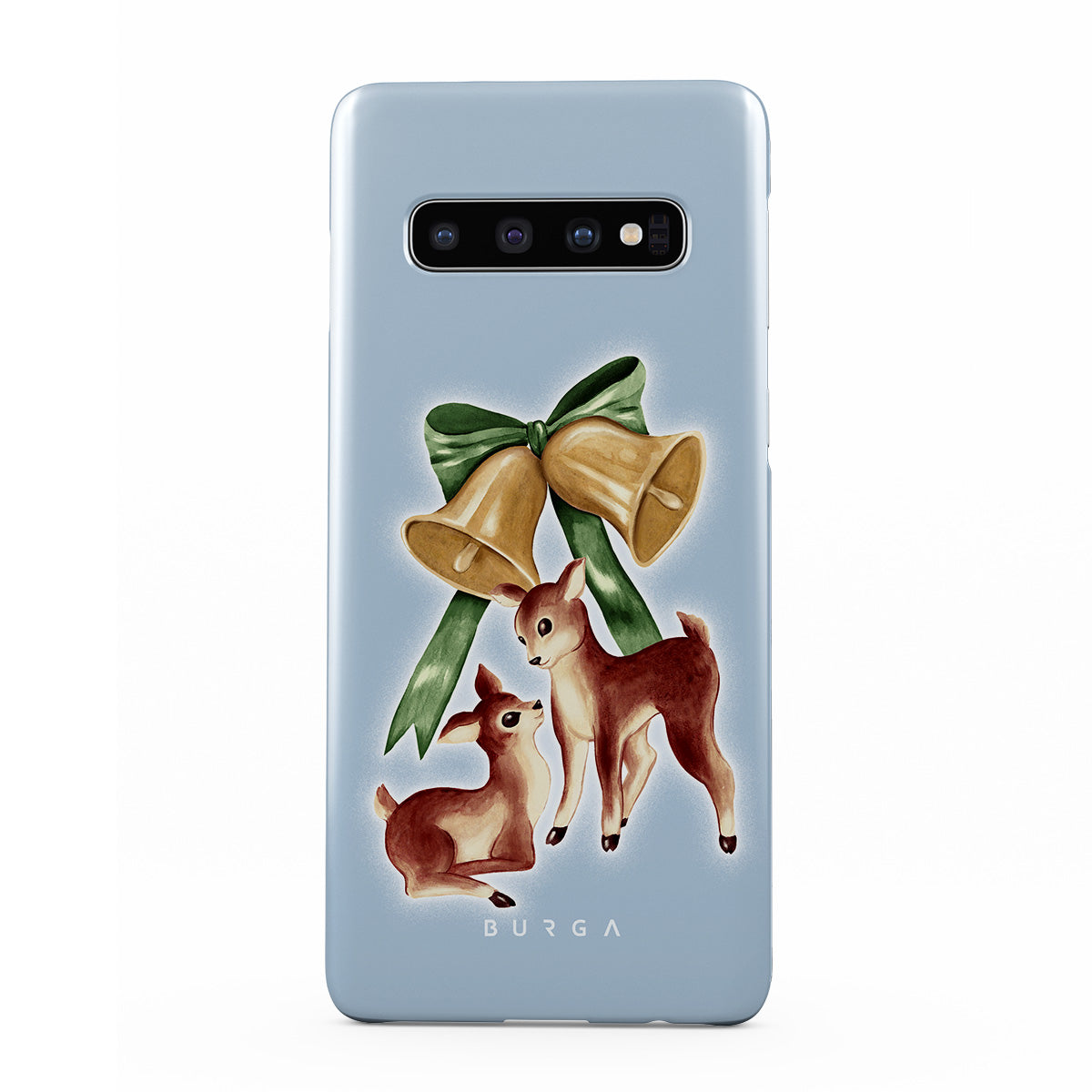 Główne elementy projektu: vintage jeleń, dzwonki świąteczne, złote dzwonki, retro ilustracja jelenia, młody jeleń, jasnoniebieskie tło