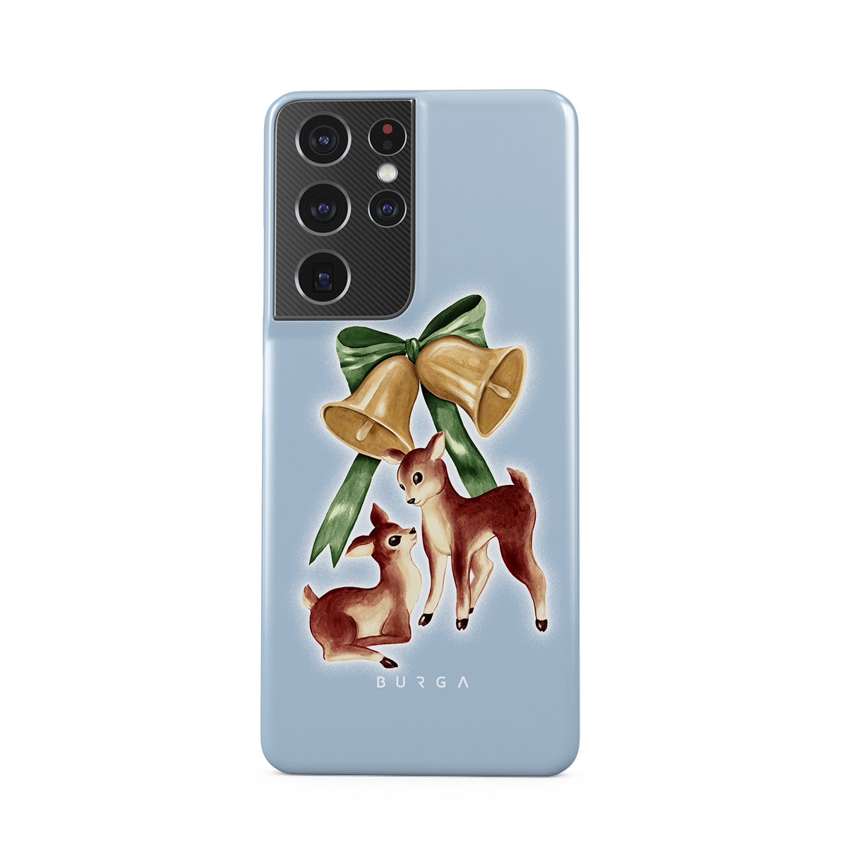 Główne elementy projektu: vintage jeleń, dzwonki świąteczne, złote dzwonki, retro ilustracja jelenia, młody jeleń, jasnoniebieskie tło