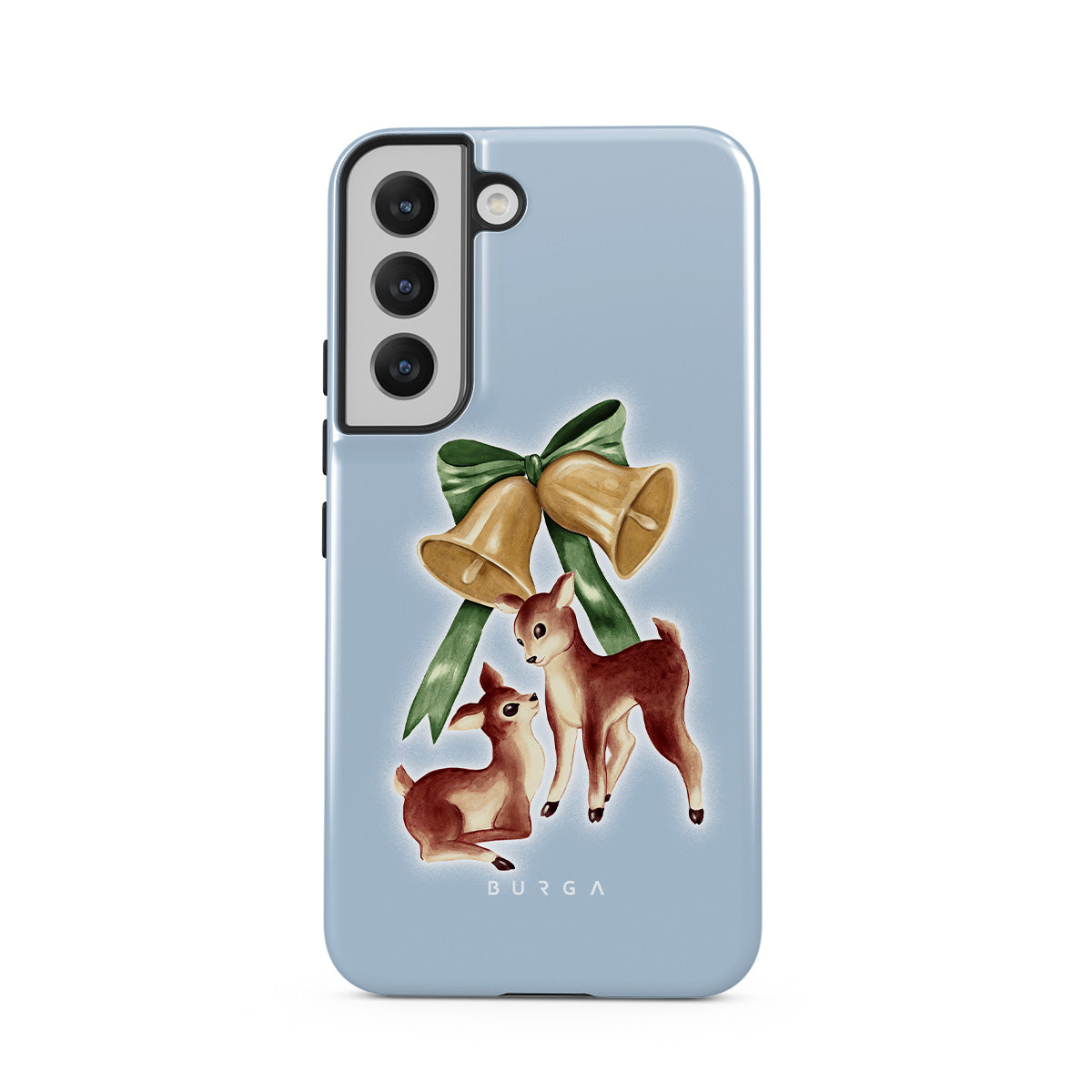 Główne elementy projektu: vintage jeleń, dzwonki świąteczne, złote dzwonki, retro ilustracja jelenia, młody jeleń, jasnoniebieskie tło