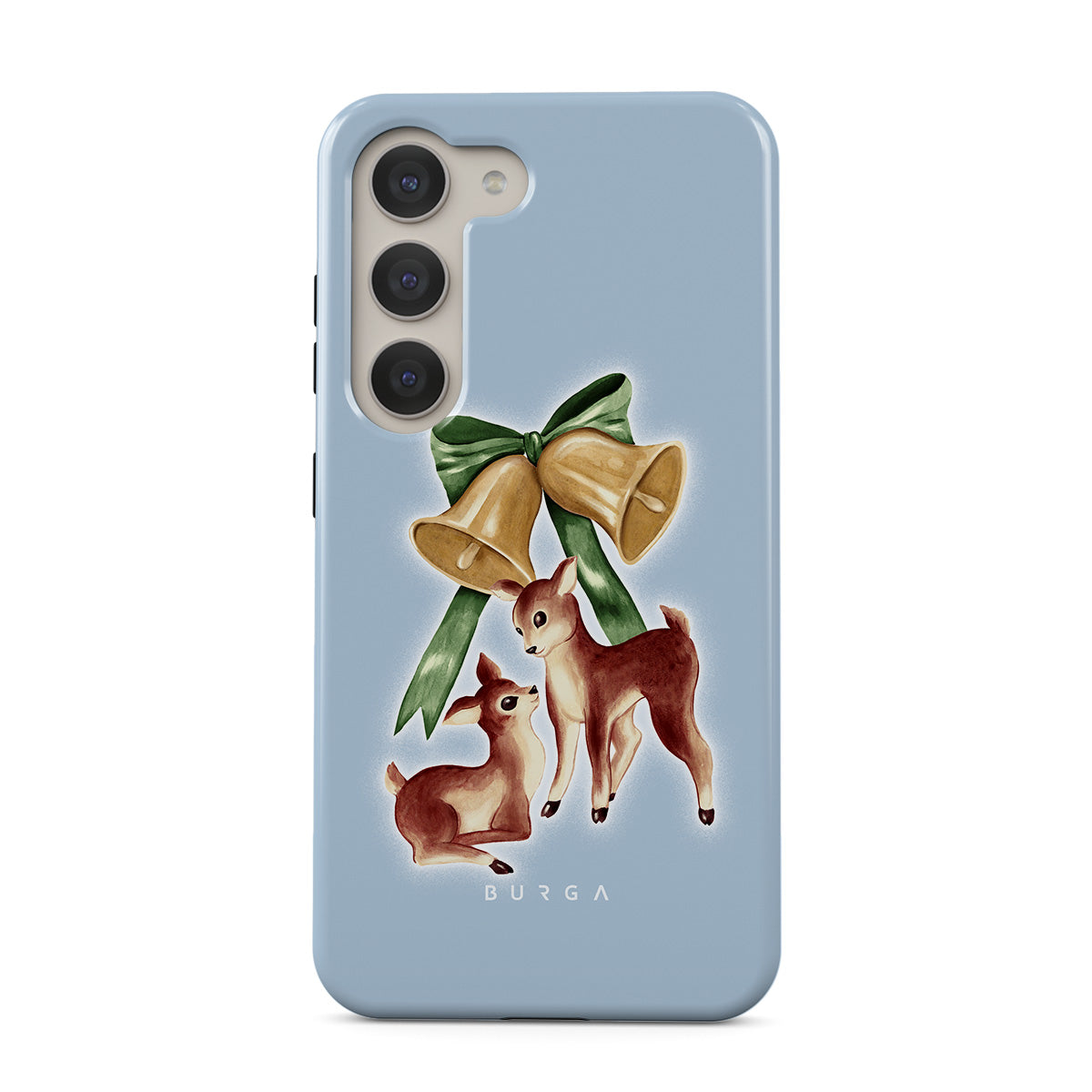 Główne elementy projektu: vintage jeleń, dzwonki świąteczne, złote dzwonki, retro ilustracja jelenia, młody jeleń, jasnoniebieskie tło