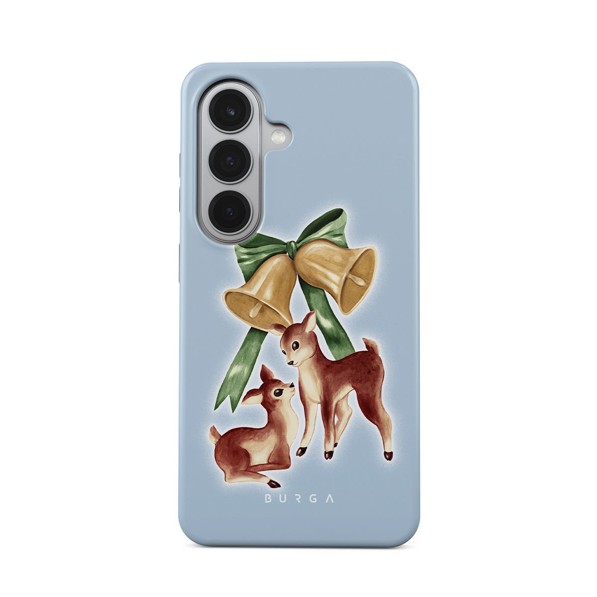 Główne elementy projektu: vintage jeleń, dzwonki świąteczne, złote dzwonki, retro ilustracja jelenia, młody jeleń, jasnoniebieskie tło