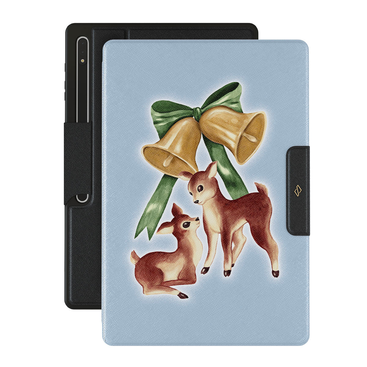 Główne elementy projektu: vintage jeleń, dzwonki świąteczne, złote dzwonki, retro ilustracja jelenia, młody jeleń, jasnoniebieskie tło