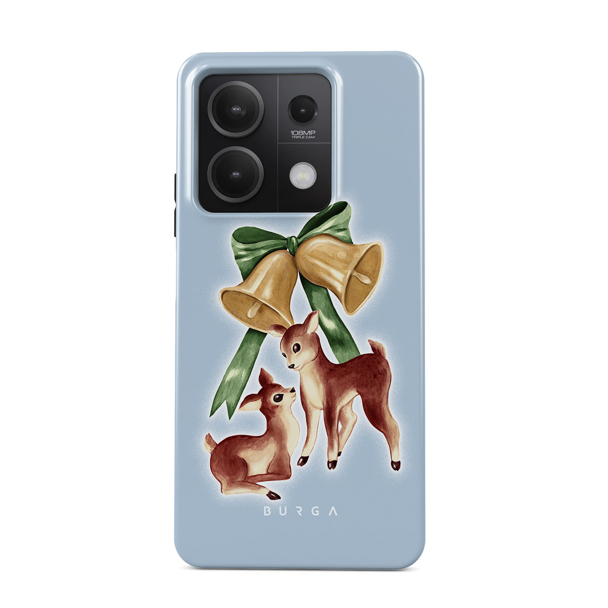 Główne elementy projektu: vintage jeleń, dzwonki świąteczne, złote dzwonki, retro ilustracja jelenia, młody jeleń, jasnoniebieskie tło